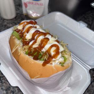 Pão de Hotdog, delicioso molho de tomate, maionese, duas salsichas, mussarela, purê de batata, bacon picadinho, alface, vinagrete, milho e batata palha.