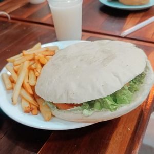 Pão, frango, queijo, peito de peru , alface, tomate, molho verde, batata frita, orégano
