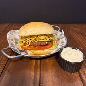 Pão, bife de hambúrguer artesanal 90g queijo mussarela, batata palha, alface, tomate e maionese da casa