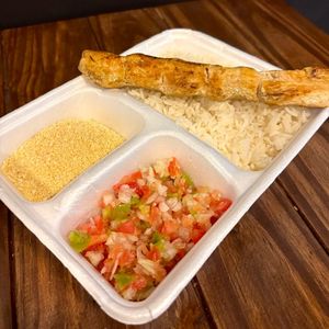 A combinação perfeita pra matar a fome com muito sabor! Espetinho suculento a sua escolha acompanhado de arroz soltinho, farofa e vinagrete. Uma refeição caseira e caprichada, do jeitinho que você gosta!