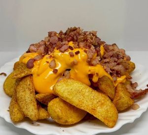 Batatas rústicas temperadas com páprica defumada, cobertas com creme de cheddar cremoso e pedaços de bacon.