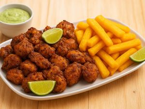 Karaguê de frango empanado frito, crocante por fora e suculento por dentro, acompanhado de mandioca frita dourada e pedaços de limão frescos. Acrescente apenas +R$5,00 e leve junto nosso molho exclusivo de maionese verde temperada da casa. Tags: frango temperado, frango com mandioca, mandioca crocante, porção família, petisco de bar, porção completa, frango com molho, frango sequinho, mandioca com limão, porção para dois, porção para amigos, frango artesanal, frango caseiro, frango saboroso, comida brasileira, porção de boteco, frango tradicional, frango com maionese, porção irresistível, porção acompanhada.