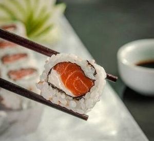 Base De Arroz Envolto Salmão , Creme Cheese E Queijo Bri Finalizado Com Tare E Molho Thai