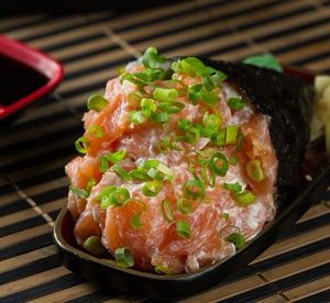 Cone de alga crocante, arroz temperado e cubos de salmão fresco, finalizado com cebolinha — sem cream cheese.