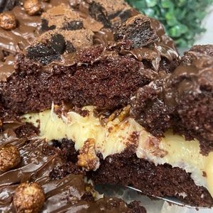 Massa chocolate com um sensacional recheio de brigadeiro trufado finalizado com lascas de brownieer Obs:forma de 16cm rende aproximadamente 8 fatias