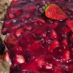 Espetão suíno com salada de batata com maionese, vinagrete, tropeiro, farofa crocante e geléia de morango.