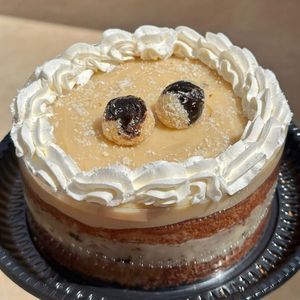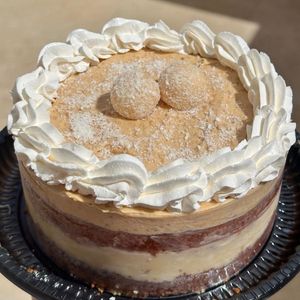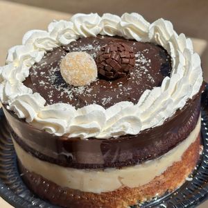 Bolo estilo torta 2 camadas de bolo fofinho molhadinho de chocolate e baunilha recheio de ninho com coco e chocolate serve aproximadamente 6 pedaços