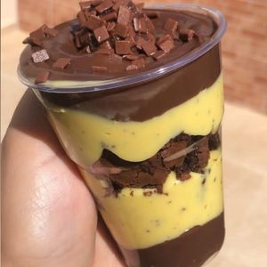 Brigadeiro cremoso,pedaços de brownie ,mousse de maracujá