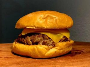 HambĂșrguer 130g no pĂŁo australiano com cebola caramelizada, cheddar e bacon crocante.