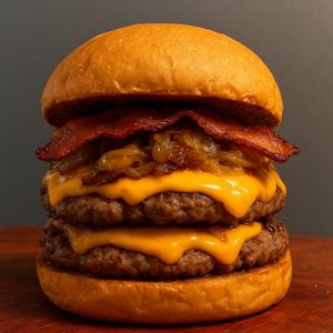 Dois hambĂșrgueres de 130g no pĂŁo australiano com cheddar cremoso, cebola caramelizada e bacon crocante.