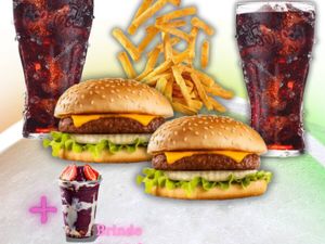 Batata frita de 200g ou bebidinha gelada até 500 ml ou 1 açaí geladinho Ou 1 pastel crocante de 200g ou 1 x classico Hambugue caseiro 1 carnes, com pão de gengilim ou tradicional, com salada alface, tomate e cebolada caramelisada (sabor da casa ) e 2 fatias de queijo .