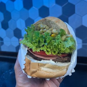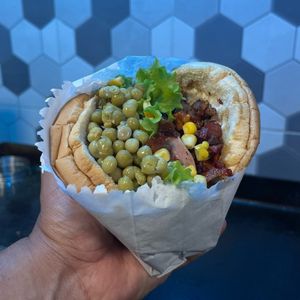 Pão, hambúrguer, calabresa, milho, ervilha, tomate, alface, pepino, maionese e batata palha.