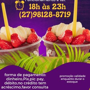 Açaí super cremoso,bem recheado,nele vc pode adicionar: 3 frutas 6 complementos 3 coberturas