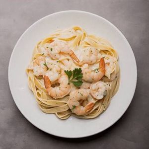 Massa fettuccine, Molho branco, Camarão, mussarela, coentro, cebolinha, alho e tomate.