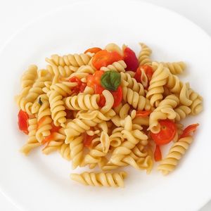 Massa aldente, alho laminado, tomate cereja e azeite.