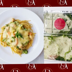 Massa aldente com creme branco com requeijão cremoso, frango em cubos, brócolis e cenoura cozidos no vapor e finalização com mussarela ralada . Serve 2 pessoas.