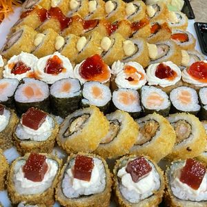 4 Sashimis de Salmão, 4 Sashimis Atum Braseado, 4 Niguris,( 2 Braseados com cream cheese 2 Crus) 2 Gunkans,( salmão braseado com cream cheese e alho poró) 8 Hossomakis de salmão. 8 Uramakis, (4 Camarão empanado em tempura picantes ) 4 de salmão com cream cheese e cebola crispy com furikaky) 8 Hot Rolls de kani .( 2 maionese picante 2 cream cheese 2 cream cheese goiabada 2 cream cheese e geleia de frutos vermelhos picante) - Acompanha * 4 Saches de molho Shoyu * 2 Hashis * 2 Molheiras