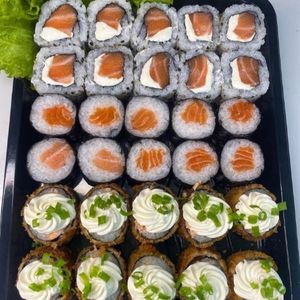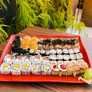 5 uramakis Filadélfia 5 uramakis tropical 5 rosso salmão 5 rosso kani 5 rosso pepino 5 joes light (3 pepino salmão batido 2 geleia de morango) 5 uramakis couve crispy 5 uramakis alho frito 4 Joe goiabinha 6 batera salmão batido com couve