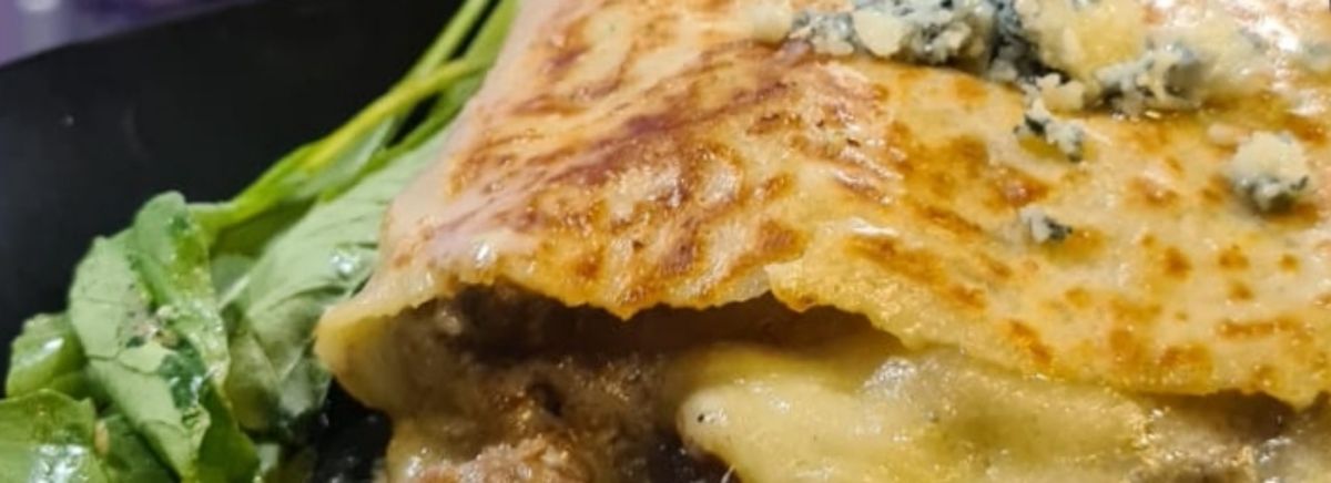 Carne picadinha ao molho de gorgonzola com queijo mussarela.