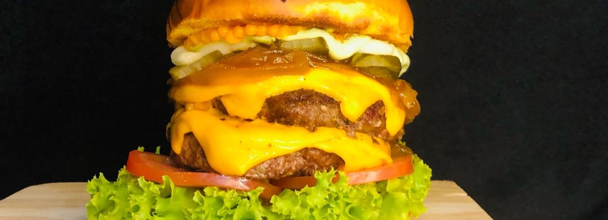 Pão de brioche,2 blend bovina 130g, 12 fatias de bacon,4 queijo cheddar, maionese caseira e molho da casa