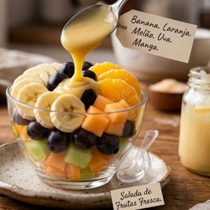 Banana, laranja, uva, melão, manga, leite condensado Todas as frutas são frescas, cortadas na hora!