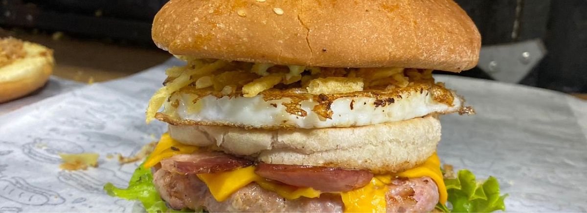 Pao 4 cortes, 5 carnes, 4 ovos, 5 camadas de bacon e calabresa, 5 camadas de cheddar fatiado, alface, tomate, barbecue, billy jack, maionese da casa, batata filetada, cebola crispy.
