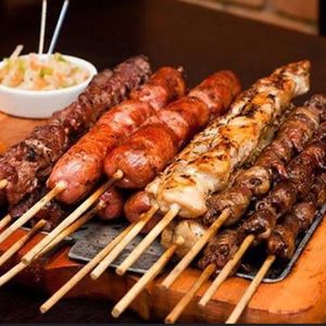 Carne - Frango - Linguiça - Coração - Kafta - Queijo Coalho - Queijo Mussarela - Pão de Alho.