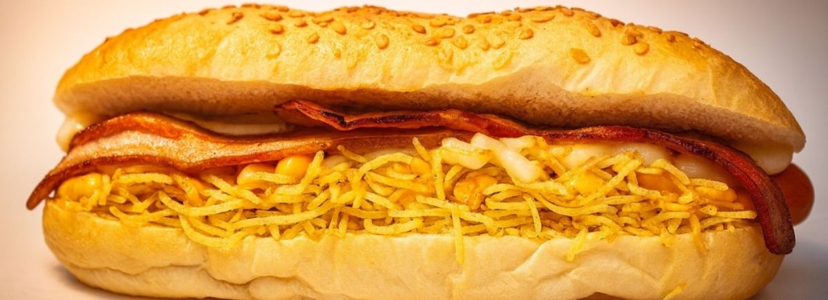 Baguete de parmesão, linguiça Toscana sadia, mussarela, purê, maionese, ketchup, mostarda, milho, ervilha, bacon, batata palha e cheddar ou Catupiry ou provolone.