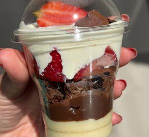 O encontro perfeito entre cremosidade e intensidade! Começamos com um creme de Ninho super leve e macio, seguido de um brigadeiro belga cremoso. Na sequência, pedaços de brownie fofinho e chocolatudo, que trazem aquela explosão de sabor. Depois,uma camada de morango e finalizado com creme de Ninho aveludado. No topo, pedaços extras de brownie e morango , para transformar cada colherada em pura felicidade.