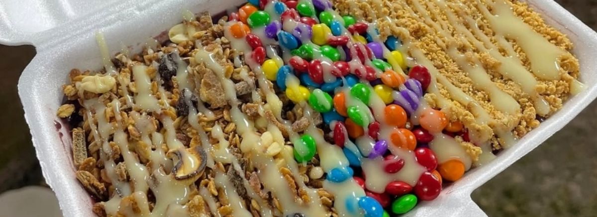 Açaí premium, leite em pó, morango, m&m, creme de avelã e leite condensado.