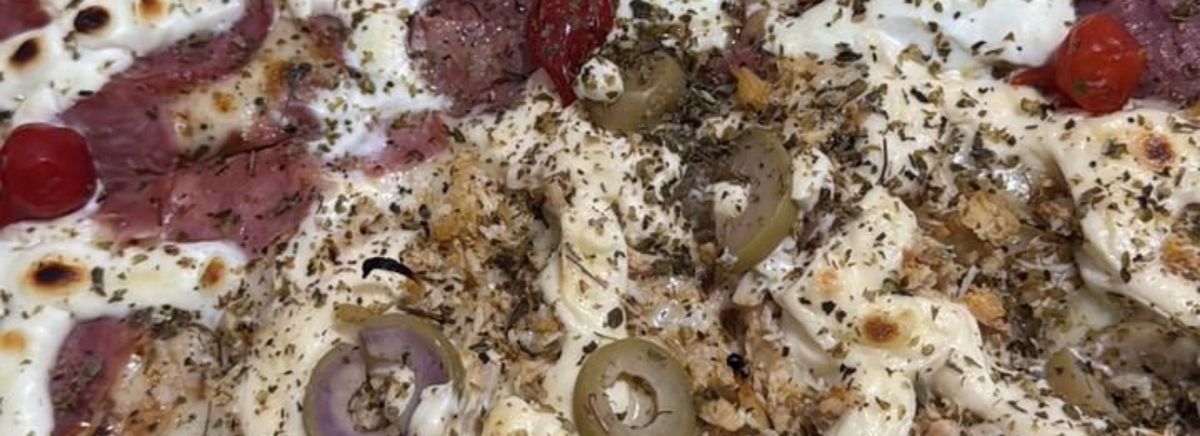 Molho, massa, mussarela, atum, cebola e azeitonas fatiadas