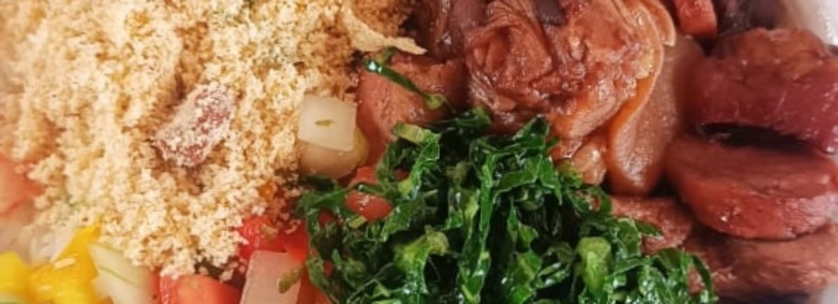 Arroz, bisteca, linguiça, tutu de feijão, ovo frito, torresminho, banana empada e couve refogada,
