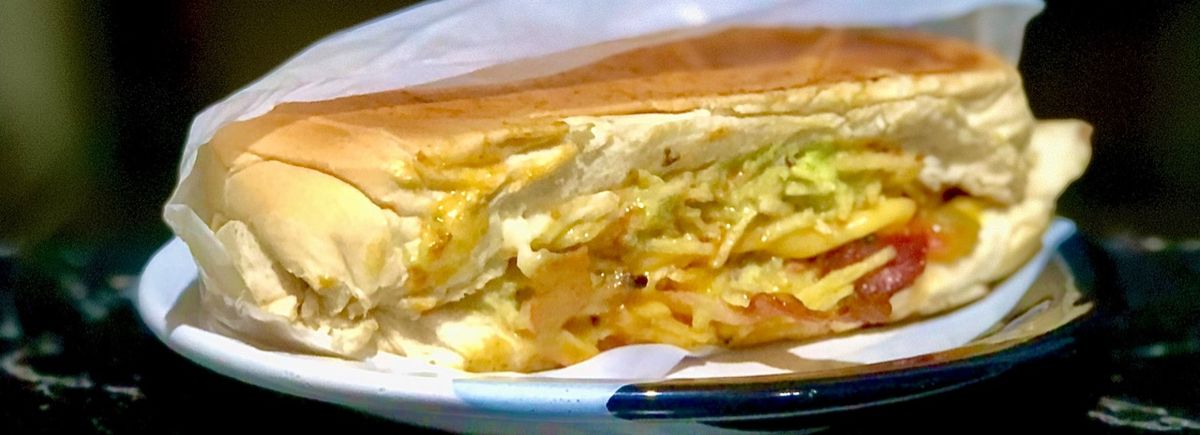 Pão, purê, 2 salsichas, katchup, mostarda, maionese, milho, vinagrete e batata palha
