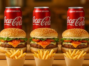 3 Hambúrgueres + 3 Fritas (130g) + 3 Guaraná Antárctica ou Coca Cola 350ml