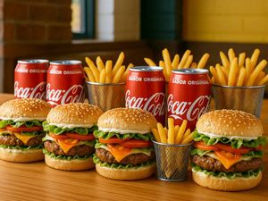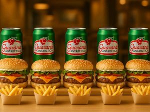 Perfeito para Compartilhar (ou Matar a Fome em Dose Dupla)! São 2 Hambúrgueres Suculentos, Preparados com Todo Cuidado e Sabor, Acompanhados de 2 Porções de Fritas Crocantes de 130g e 2 Refrigerantes 350ml — Escolha entre Guaraná Antarctica ou Coca-Cola.