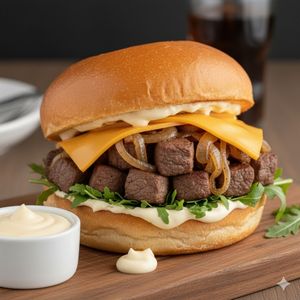Pão de brioche, maionese caseira, duplo queijo, rúcula, filé picado acebolado