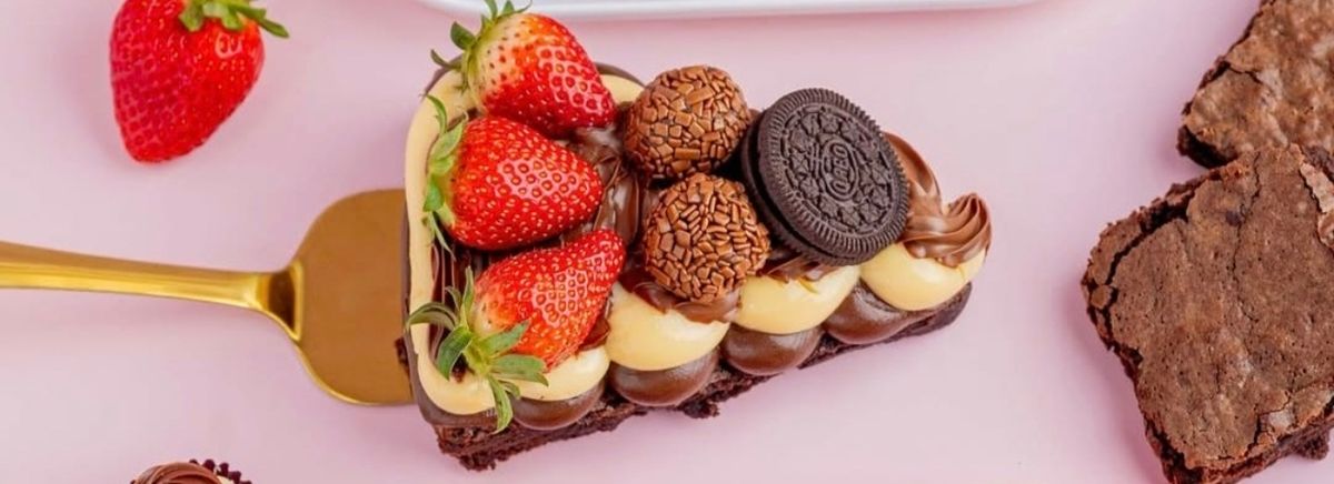 Brownie, brigadeiro ao leite 50% cacau,leite Ninho,Nutella, oréo, morangos e brigadeiro ao leite .