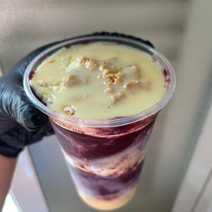 Delicie-se com nosso irresistível açaí batido com leite em pó, leite condensado e banana! Um saboroso convite para criar sua própria combinação, adicionando suas guloseimas favoritas. Experimente essa explosão de sabores e surpreenda-se!