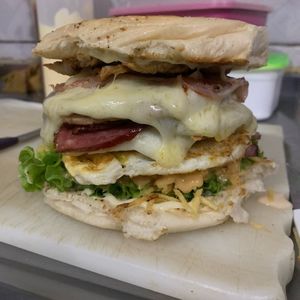 Pão hambúrguer alface tomate milho batata palha molho rose queijo presunto catupiry
