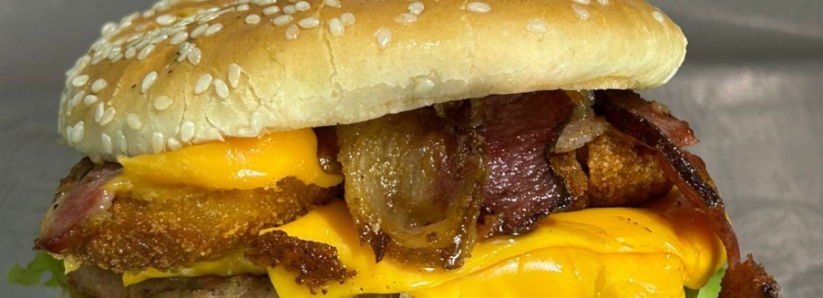 Pão, 2 carnes, 2 fatias de queijo, cheddar cremoso, salada, milho, ervilha, e batata palha.