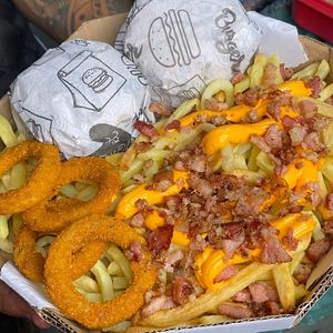 4 x-tudos, batata com cheddar cremoso ou catupiry originais,bacon crocante em cubos,6 anéis de cebola, 6 nugget