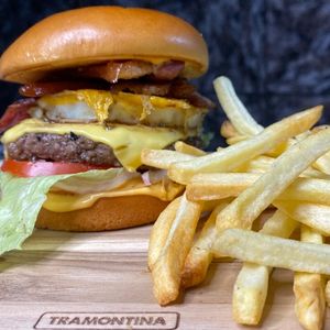 Pão levemente tostado , carne suculenta, 2 queijos cheddar fatiado+creme de cheddar original,ovo, bacon crocante, alface americano fresco, tomate, cebola roxa, molho especial, ketchup