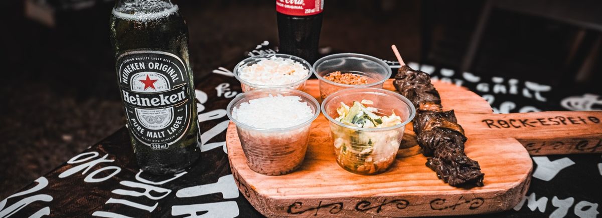 Pão francês, 2 espetos, salada, pedaços de bacon e molho especial
