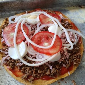 Pizza moda da casa carne moída tomate cebola e queijo.