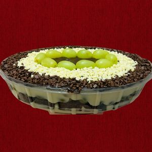 Uma segunda versão com brigadeiro branco, brownie, uvas, brigadeiro meio amargo, finalizado com mais uma camada de brigadeiro branco.