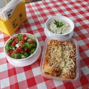 500gr da Deliciosa lasanha caseira, com camadas de massa intercaladas com molho bolonhesa e queijo derretido. Acompanha salada fresca e arroz