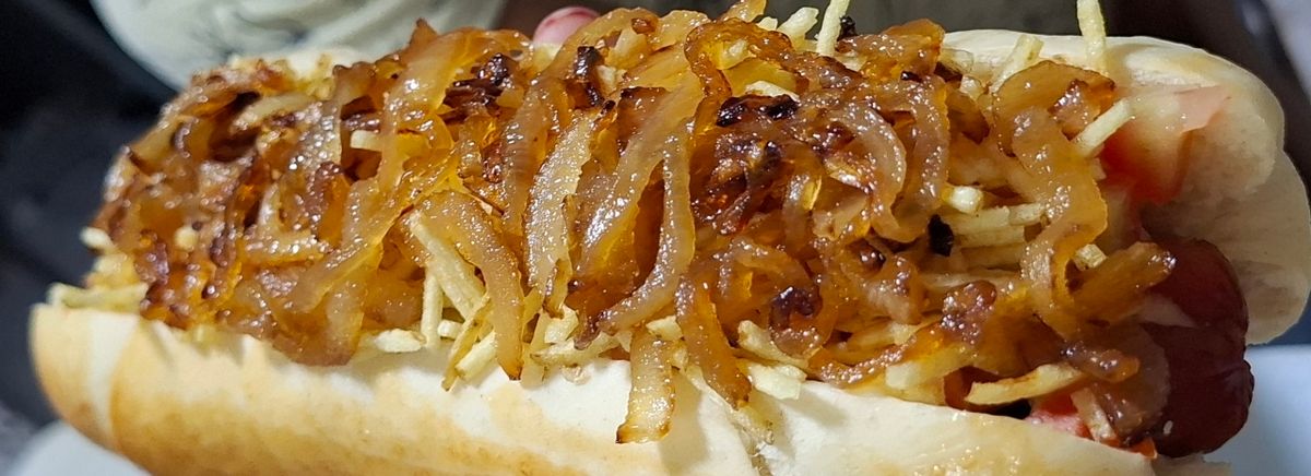 Big Pão Artesanal, salsicha, tomate, cebola, pimentão, milho, ervilha, batata palha, molho rose da casa.