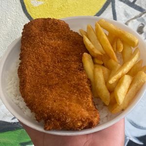 Marmita com delicioso filé de frango empanado na massa crocante acompanhado de arroz branco, feijão e batatas fritas. Marmita indicada para 01 pessoa.