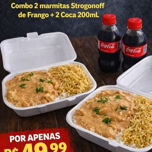 2 marmitas de strogonoff + 2 refri pet 200ml Acompanha: arroz, strogonoff, batata palha e salada.