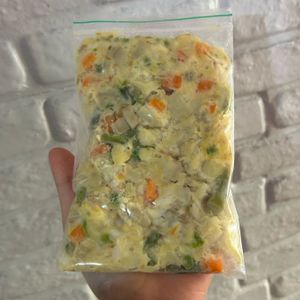 Feita com filé de peixe, batata, cenoura, vagem, ervilha, batata doce, iogurte natural, cúrcuma e linhaça dourada.